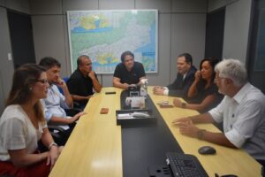Na cabeceira da mesa o presidente da Colares Linhares, Moyses Pimentel; à esquerda, a Gestora Jurídica, Mayara Moriconi; o Diretor-Comercial, Reginaldo Silva e o Diretor de RH, Cosme Lamim. Á direita, parte da equipe da AEERJ presente ao encontro: o Presidente-Executivo, Ícaro Moreno; a Assessora da Presidência, Carmem Juliani e o Assessor Jurídico, Fernando Rangel.